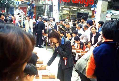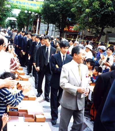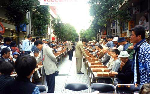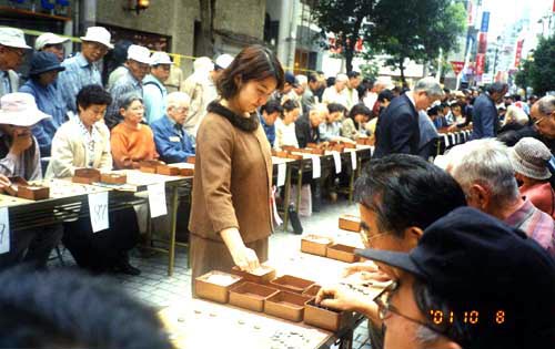 湘南ひらつか囲碁まつりの500面打ち大会に行った。東京から東海道本線は各駅停車。各駅停車はいい。人が歩いているのが見えるし、自転車で走っているのも見える。この駅の近くには住んだことがあったとか、あそこには行った事があるとか、あんな事こんな事が思い出される。珍しい光景も見られる。周りの人たちもナップザックを背負ったりウエストポーチをつけたり気楽ないでたちでゆったり構えている。大船の観音様を丘の上に見て相模川を越えるともう平塚だった。「木谷道場」の人たちもこの東海道本線に乗ったのだろう。曇り時々晴れで平塚のパールロードは暑からず寒からず程よい囲碁日和だった。相州太鼓の勇壮な響き、アコ-ディオンの音色は平塚の街にあっている。1時40分、78名のプロ棋士が入場してきた。 |